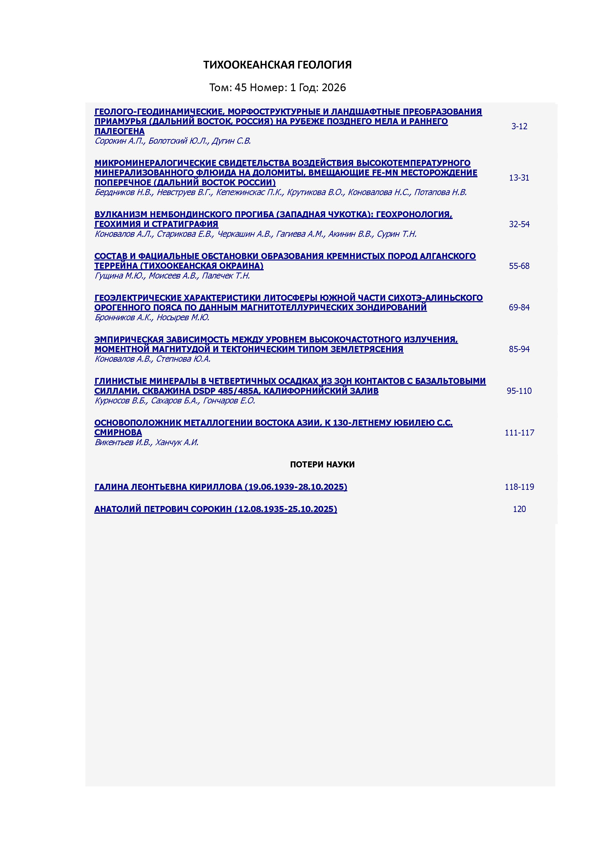 Тихоокеанская геология 2026 Т. 45 № 1 | Тихоокеанская геология 2026 Т. 45 № 1 | 2026 | 1 |