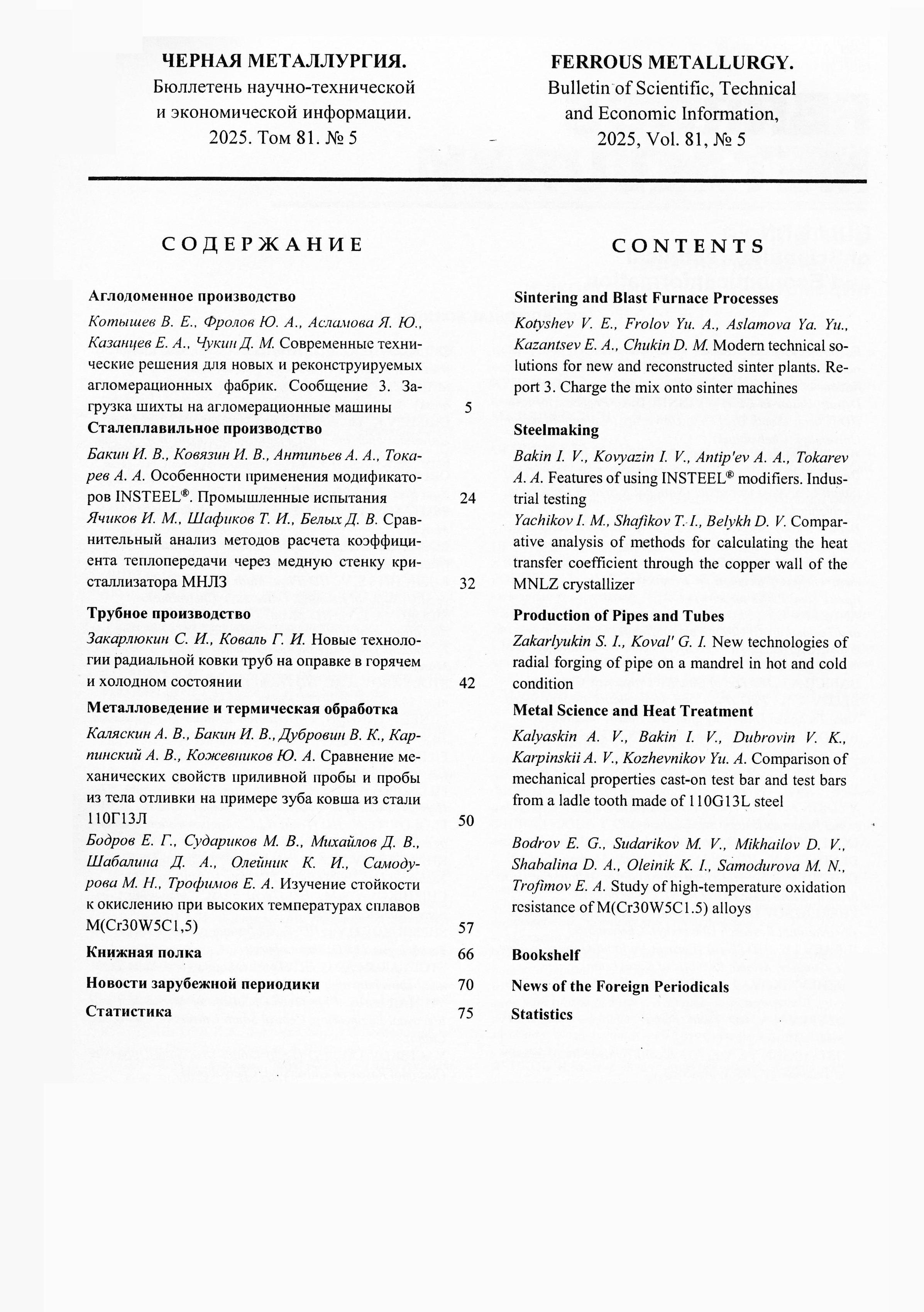 05.09.2025-16:38 Черная металлургия. Бюллетень 2025 Т. 81 № 5 Черная металлургия. Бюллетень 2025 Т. 81 № 5 2025 5